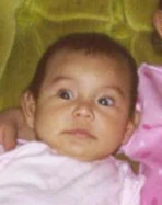 Characteristics: Hispanic female with black hair and brown eyes. She has a heart-shaped birthmark on her upper right arm. She was last seen wearing a diaper and white jumpsuit with snaps extending down the legs. She was sitting in a white infant carrier with a green and white striped cushion.