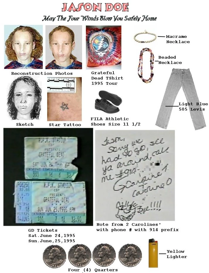 Results: Solved. In 2015, photographs surfaced of a man wearing similar clothes to the one worn by Jason Doe. The man looked quite similar to his reconstruction photographs as well. The man was also named Jason and was known to be a fan of the Grateful Dead. His roommates recalled that he had lived in Illinois and South Carolina. However, they could not recall his last name.